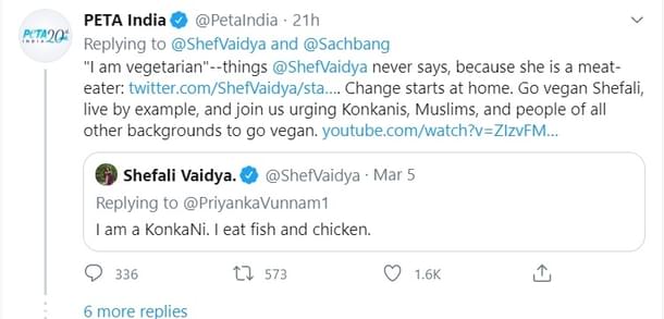 "I am vegetarian"--things @ShefVaidya never says, because she is a meat-eater: https://twitter.com/ShefVaidya/status/1235534874506752001. Change starts at home. Go vegan Shefali, live by example, and join us urging Konkanis, Muslims, and people of all other backgrounds to go vegan", tweeted PETA.