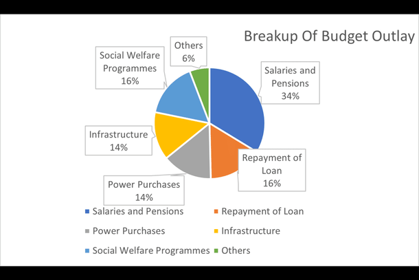 Salaries and pensions would take up Rs 2542 crore (21.92 per cent) and Rs 1455 crore (12.53 per cent) respectively. The other major components are Rs 1850 crore (15.95 per cent) for repayment of loans, Rs 1690 crore (14.57 per cent) for purchase of power, Rs 1623 crore (13.9 per cent) for infrastructure projects and Rs 1856 crore (16 per cent) for social welfare programmes.