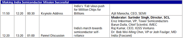 In subsequent panel discussions also, there are representatives from companies who have already applied or have shown interest in applying for various schemes — for example, Akarsh Hebbar from Avanstrate, which is a subsidiary of Vedanta (display fab), Harshad Mehta of Silicon Power (Silicon Carbide fab), Raja Manickam of Tata Electronics (Outsourced Semiconductor Assembly and Testing or OSAT) and so on. There are also sessions focusing on semiconductor design.