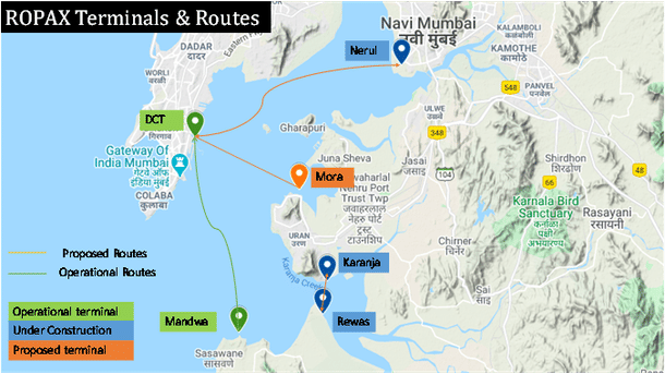 Currently, ROPAX service from Bhaucha Dhakka (Ferry Wharf) to Mandwa (Alibag) is operating successfully and reduces the road journey of 110 km to about 18 km by using waterways, thereby reducing travel time of daily commuters from about 3-4 hours to one hour.