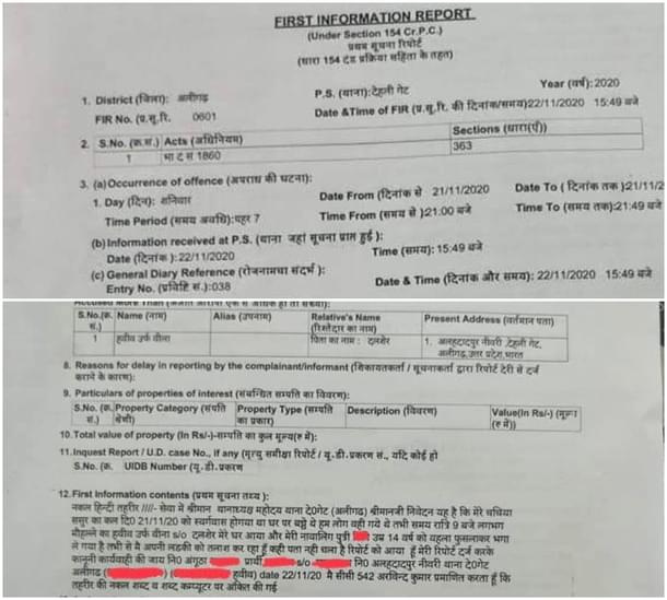 The statement by the girl’s father recorded in the first information report (FIR) - number 601/2020 at Dehli Gate police station of Aligarh district - says that a man from the neighbourhood named Habib kidnapped her. The statement says that on 21 November, when all elders of the house had gone to a relative’s funeral, Habib entered the house around 9 pm and took the girl away.