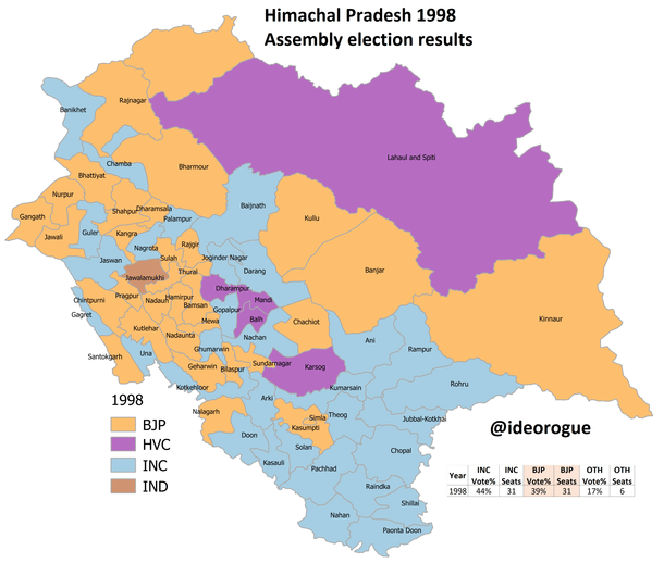 So, in 1998, it was the BJP’s turn, but only by a whisker. Both major parties got 31 seats each, and the BJP formed the government with the assistance of independents and others.