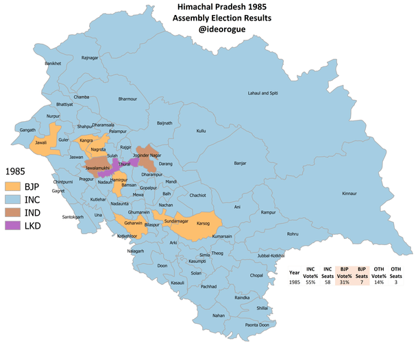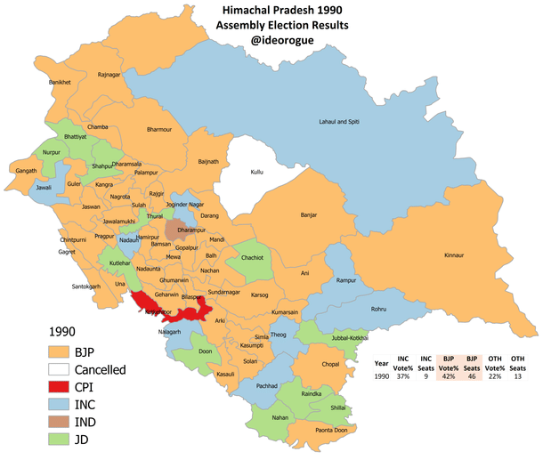 So, it is only in 1990 that the BJP, under Shanta Kumar, finally came into its own. This time, they swept the state, in a semi-tacit alliance with VP Singh’s Janata Dal, which had just dislodged Rajiv Gandhi in the Lok Sabha elections of late 1989.