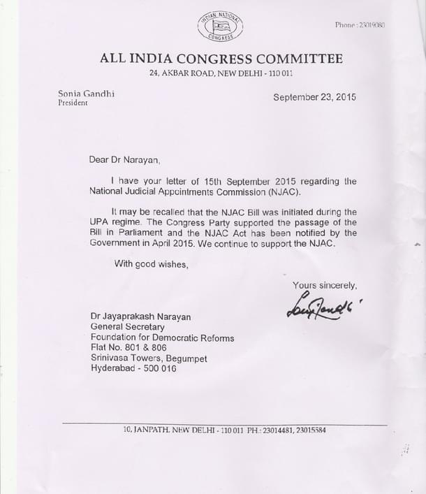 It may be recalled that the NJAC Bill was initiated during the UPA regime. The Congress Party supported the passage of the Bill in Parliament and the NJAC Act has been notified by the Government in April 2015. We continue to support the NJAC.