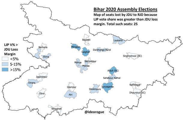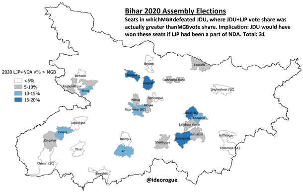 One: in 25 seats which the JDU lost to the RJD, the LJP’s vote share was greater than the JDU’s loss margin (meaning that the JDU would have won those seats if the NDA had been intact).