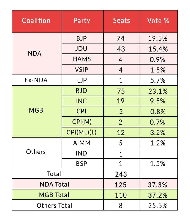 The NDA crossed the halfway mark only thanks to its two smaller partners – that too, by just three seats. It was just as close on vote shares, with the NDA pipping the MGB by just 0.1 per cent (37.3 to 37.2 per cent).