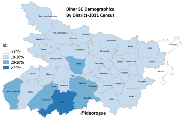 And below is a map of the state’s Dalit population by district. It shows that barring the Muslim dominated region of Seemanchal in the east, distribution is fairly uniform, with high concentration in the Magadh region of Gaya-Nalanda.