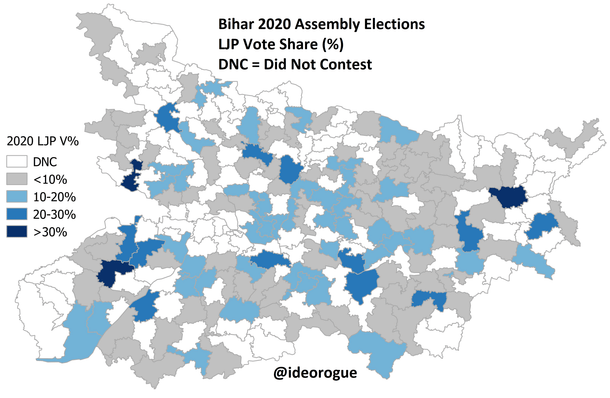 So, instead of trying to make sense of Kumar’s explanations, better to study the LJP’s vote share map. Readers may bear in mind that the LJP contested only half the seats, and only against the JDU in the main.