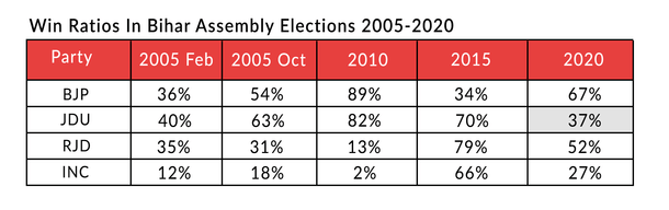 As a historical table of win ratios shows (number of seats won by seats contested), this was the JDU’s worst performance since the party was formed in 2003.