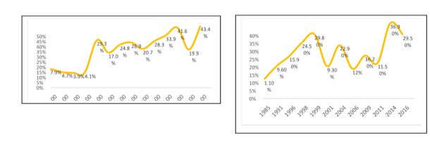 Two States serve as historic precedents. In Karnataka a combination of Urban, Border districts, Lingayats and Upper Castes helped BJP eventually notch up a majority in 2009. Once the party crossed the 20 percent mark in 1991, it went down only twice below that number in 10 elections.