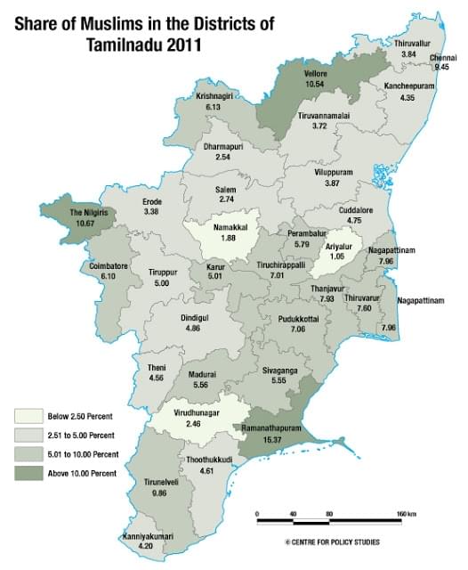 As the map below shows, Muslim presence is near or above 10 percent in Chennai, the Nilgiris, Ramanathapuram and Tirunelveli.