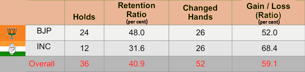 In 2008, after delimitation exercise 66 seats remain unchanged, while 24 new seats were created. BJP had won 35 of these 66 seats in 2003 but could retain only 19 of these in 2008 (54 per cent). Congress had won 29 of these 66 seats but could retain only 12 (41 per cent). On an overall basis 53 per cent seats changed hands, where people voted out the incumbent and chose another party candidate.