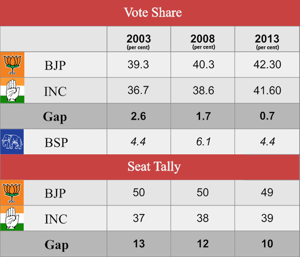 The results of the last three polls since the formation of the state depict continuity. BJP’s seat tally has been constant at 49-50 and Congress at 37-39. While vote share gap between the two main parties has witnessed a reduction from 2.6 per cent in 2003 to 0.7 per cent in 2013, the seat tally indicates a level of stability in the results.