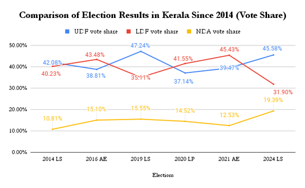 This factor, combined with the minority vote consolidating behind Rahul Gandhi because of his contesting from Amethi and the expectation that he will become prime minister, led to a historic low for the LDF in 2019.