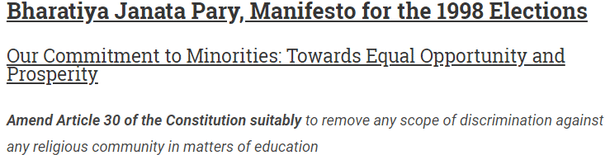 There was a complete absence of any reference to Article 30 and its amendment in the manifesto. BJS and BJP manifestos until 1998 bore a clear promise on this in their manifestos. So, it is not completely unreasonable on the part of BJP’s official party machinery to dismiss any concern or query on this front with a “we never promised that” response. We, as voters, must accept our share of blame and burden here, and become wiser going forward.