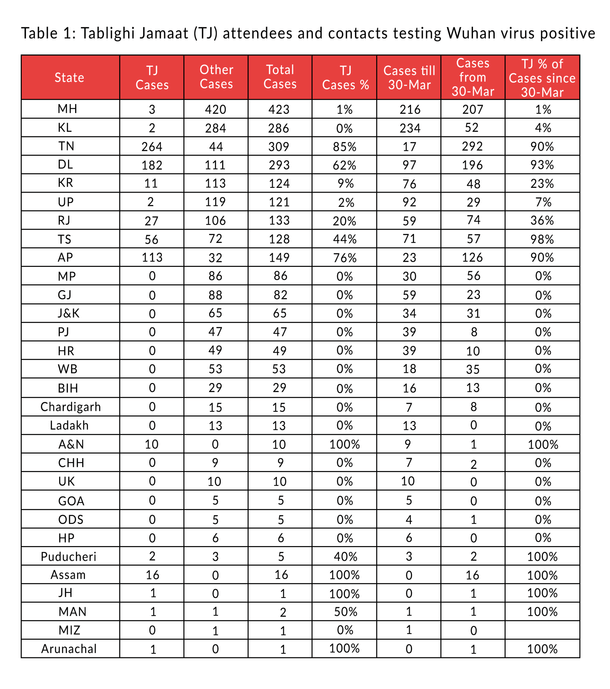 A table below segregates identified Tablighi Jamaat infections from other cases. Figures are based on crowd-sourced cluster-mapping as on the night of 2 April. They are necessarily adumbrative even if 9,000 attendees and their contacts have already been identified and quarantined, since details are still emerging.