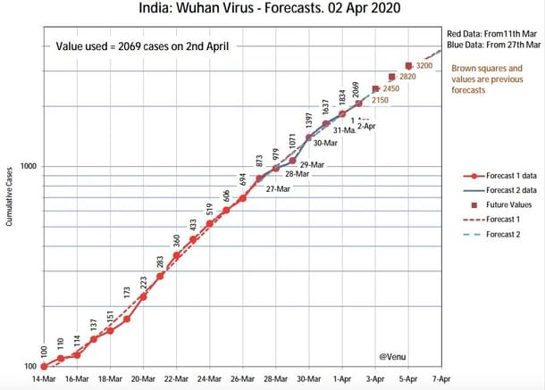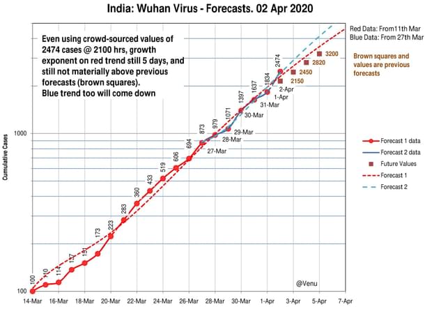 Very importantly, it must also be noted that the old forecast projected 2,450 cases by 3 April. Now, even if we assume the crowd-sourced value of 2,474 cases on 2 April to be valid, there is still only a day’s difference between two different projections on when we would touch the 2,400 mark. This means that the Tablighi Jamaat episode has had less of an overall impact at the national level than some may think.
