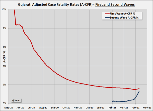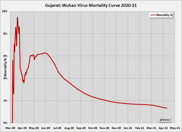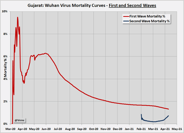 Thus, the conclusion is that while the epidemic is still raging in Gujarat, mortality rates of the second wave are mercifully lower than that of the first one. This may in fact be an indirect indicator that our vaccines are working.
