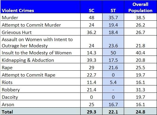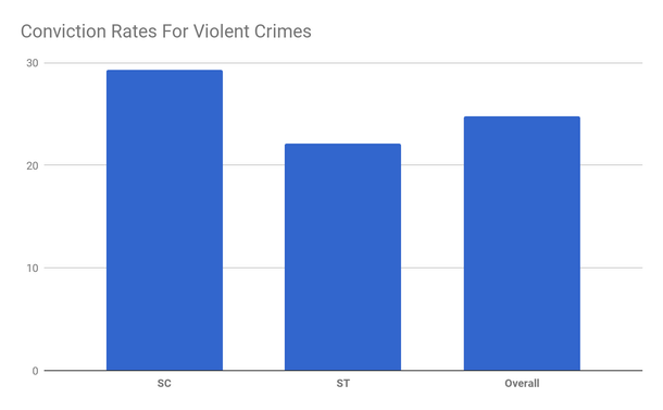 Below is the table that compiles the numbers for all the crime headings that match. And they happen to be the most important violent crimes. The conviction rates that we get when we combine these violent crimes are 29.3 per cent for SCs, 22.1 per cent for STs, and 24.8 per cent for the overall population.