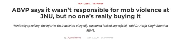 The report is titled “ABVP says it wasn’t responsible for mob violence at JNU, but no one’s really buying it”.