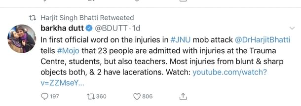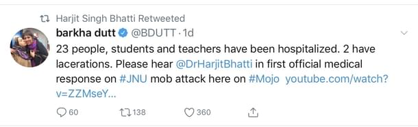 On 6 January, journalist Barkha Dutt introduced Bhatti as “first official word” and “first official medical response” on injuries in JNU violence “at the Trauma Centre” for a report done by her venture, Mojo Story.