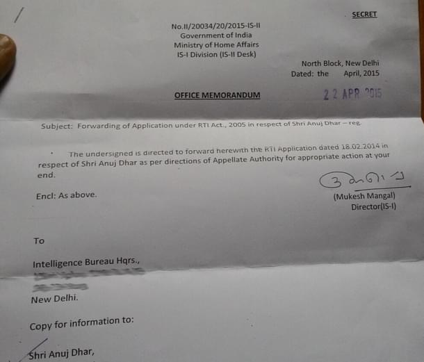 And inside the second envelope I found copy of a “Secret” official memo signed by Mukesh Mangal saying that my RTI request was being forwarded to the CPIO, Intelligence Bureau on the instructions of Appellate authority for appropriate action.