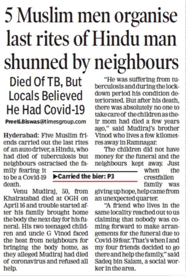 On 20 April, The Times of India published a front page report headlined ‘5 Muslim men organise last rites of Hindu man shunned by neighbours’.