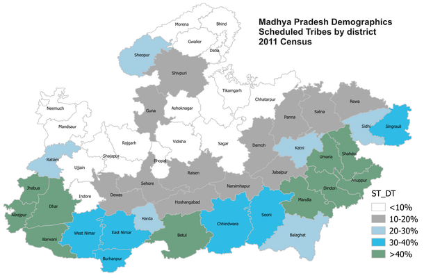 The scheduled castes are more concentrated in the northern half of the state, around Gwalior, Bundelkhand, and the western Malwa plateau (see blues in the map below).
