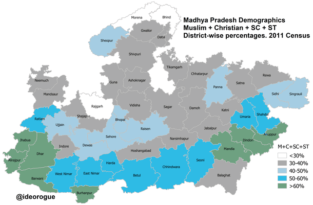 Madhya Pradesh has a sizeable tribal population that has been prone to identity politics and persistent conversion efforts. And, again, we see that the Congress won a number of seats in this belt.