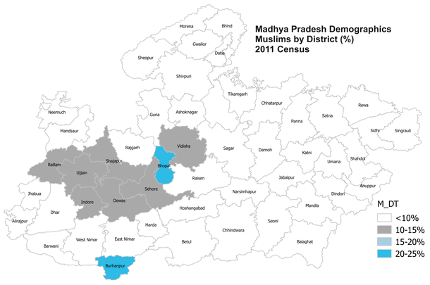 As the map below shows, Muslims are largely concentrated in the west of the state, in a belt running across the Malwa plateau from Ratlam to Bhopal. And this is where the Congress won a number of seats.