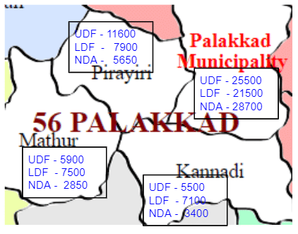 While the National Democratic Alliance (NDA) had the lead in Palakkad Municipality, it was a distant third in the three gram panchayats surrounding it, which are part of the Palakkad assembly constituency.