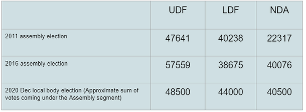 It can be assumed that the Muslim votes are likely to consolidate towards UDF this time as well and if the Hindu and Christian votes going to UDF remain same, it is likely to poll nearly 65,000 votes.