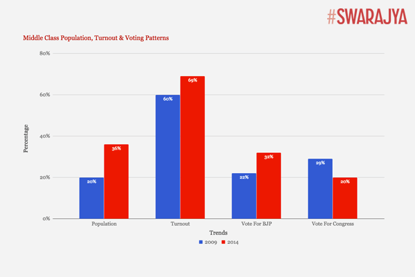 The middle class is the largest voting block today. This burgeoning class has been growing in number continuously, from 20 per cent of the population in 2009 to 36 per cent in 2014. In 2014, the Bharatiya Janata Party (BJP) ran a high-pitched campaign promising jobs and an end to corruption, drawing middle-class voters into its fold. Previously disillusioned with politics and politicians, the middle class turned out to vote in large numbers in 2014, recording a 9 per cent increase in turnout. Middle-class voters backed the BJP resoundingly, leading to a 10 per cent increase in its vote share, in contrast to a corresponding 9 per cent decline in Congress votes from this segment.