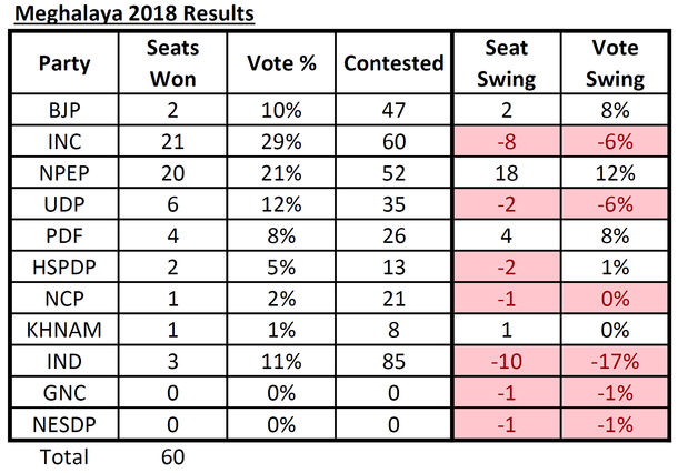 Specifically in Meghalaya, the BJP has gone from nil seats and one per cent of the vote share in 2013 to a remarkable 9.6 per cent and two seats in 2018. That may not seem like much to readers in the rest of India, but this is huge in Meghalaya, where even the Congress and the NPP poll less than 30 per cent.