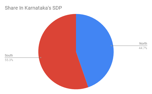 The analysis of SDP share of the north and south regions reveals that 70 per cent of the domestic product is from south Karnataka, while north Karnataka contributes the rest. North Karnataka contributed around 44.7 per cent of the domestic product with 49.3 per cent of the population share, and south Karnataka contributed 55.3 per cent.