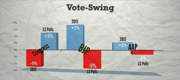 A 12.5% swing in favour of the BJP from 2013 December to 2014 April had resulted in the saffron party winning 28 more seats which meant more than 2 seats for every percentile increase in vote-share.