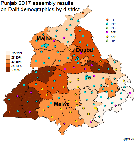 It is the same with the AAP, whose twenty seats in 2017, analysts said, were wrested on the back of the Dalit vote. And yet, a map of those election results, overlain on Dalit demographics by district, show to the contrary that those AAP victories were actually restricted to south-central Punjab in the Malwa region; they didn’t win a single seat in those areas where the Dalit vote is more heavily concentrated – in the southwest, or the Majha region, and only two seats in the Doaba.