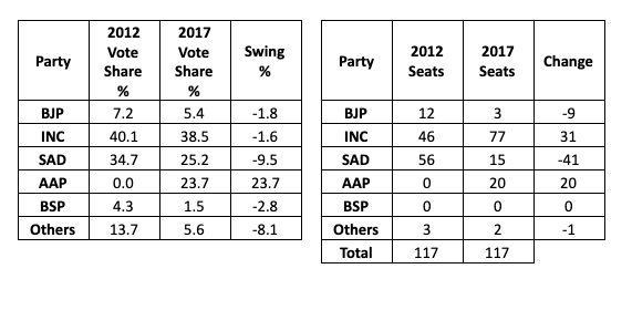 To recap the region’s politics briefly, the incumbent SAD was nearly wiped out in the 2017 elections, with almost a third of their vote going to the AAP. In fact, the AAP took 9.5 per cent of the vote share from the SAD, 8 per cent from ‘Others’, and bits from the rest, to tally a respectable 24 per cent. Amidst this mayhem, the BJP remained on the fringes in 2017, with 5 per cent of the votes, and three seats.