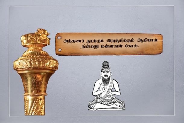 The sceptre of the king is the firm support of the Vedas of the Brahmin, and of all virtues therein described. (Kural 543: GU Pope)