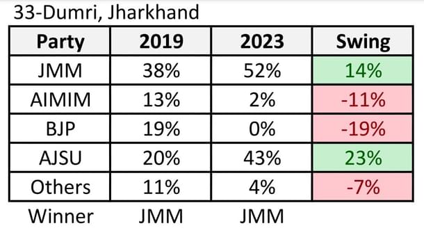 Yet, although the JMM won, the key takeaways are the manner in which the BJP’s votes efficiently, and neatly, consolidated with its ally, the AJSU; the consolidation of the identity vote in the JMM ranks; and, surprisingly, a resultant swing of around 5 per cent of the vote from the ‘Others’ to the AJSU.