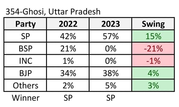 This seat in eastern Uttar Pradesh has remained as a Samajwadi Party (SP) hold even though its sitting MLA, Dara Singh Chauhan, defected to the BJP and contested the byelection on a BJP ticket.