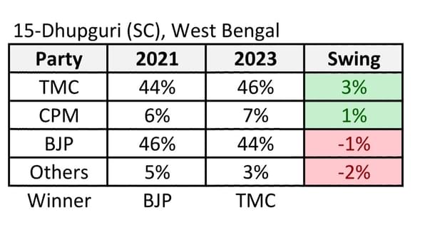 While the BJP has lost the seat by a narrow margin, as a result of a minor swing in the popular vote, we see that its vote base is still intact. The inference is that the demise of sitting MLA Bishnu Pada Roy, a popular local BJP leader, is a gap which it has yet to recover from.