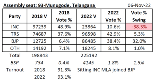 Bottom line: BJP supporters shouldn’t get too carried away by the verdict. There's still some distance to go before the BJP replaces the INC, and then displaces the TRS. Still, this is now only a matter of time.