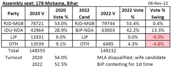 This is an RJD stronghold which went for a by-election because the sitting RJD MLA was disqualified, after being convicted in an arms case. So, it is no great surprise that the convict’s wife won on an RJD ticket.