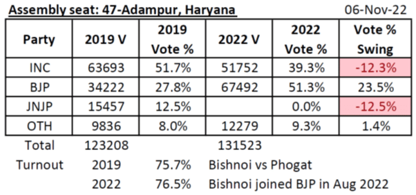 Interestingly, JNJP votes (of the Chautala family, another Haryanvi political dynasty founded by the late Devi Lal) have shifted fully to the BJP. It means that their alliance with the BJP continues intact.