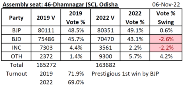Bottom line: these results mark the waning of the BJD, the gradual ascendancy of the BJP, and the erasure of the Congress from one more state in the country.
