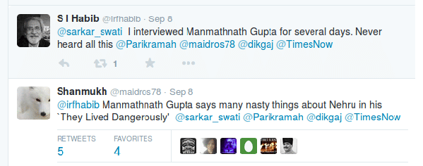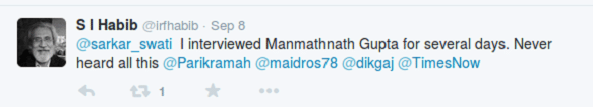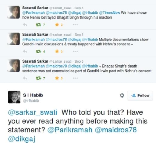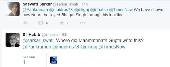 Our subsequent interactions on SM with Prof. Habib were even more astonishing. A tweep @parikramah had brought to our attention an article by Prof. Habib enumerating Bhagat Singh’s opinions on Jawaharlal Nehru and Subhas Bose. In this context, we pointed out that