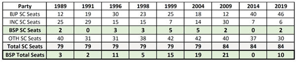 In 2009, when the BJP was at a decadal nadir, and the BSP registered its best outing by winning 21 seats, it only won two reserved seats.