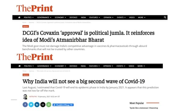 Then on 19 January 2021, the same person listed out reasons why India would not see a big second wave of Covid-19. He ended his article advising: 'The risk of a second wave is small in most places across the country because most people have already been exposed. For the same reason, we might not need to be overly concerned about the new variants either.'