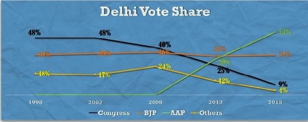To lose an election in which you are ahead takes a lot of mistakes to be committed and BJP has lost Delhi despite being ahead at the beginning of the race. What a loss this has been. AAP has won 53%+ popular vote share and a clear landslide while BJP has struggled at its base level of 34% which the party has had since 2 decades now. AAP has completely gobbled up Congress and “others” vote-bases while BJP has remained stagnant. It is as if Delhi has simply decided to temporarily disregard the Modi wave and not give any incremental vote to BJP. Instead all the incremental vote has gone to AAP. No pollster, including us at 5Forty3 datalabs could project such a landslide for AAP. This is what happens when there is a trend reversal in an election. After a trend reversal, the leading party manages to simply accumulate far greater vote-share than the whole opposition combined.